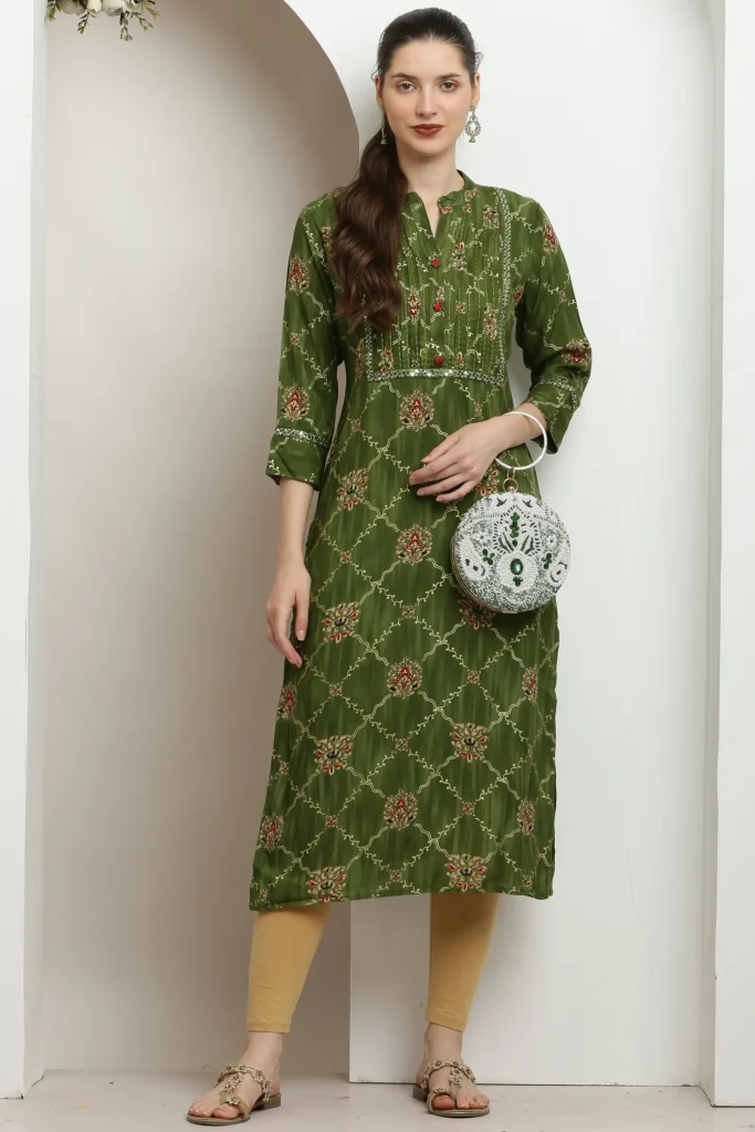Vidalia Elegant Olive Green Pintuck Kurta with Floral & Geometric Print Regular Fit