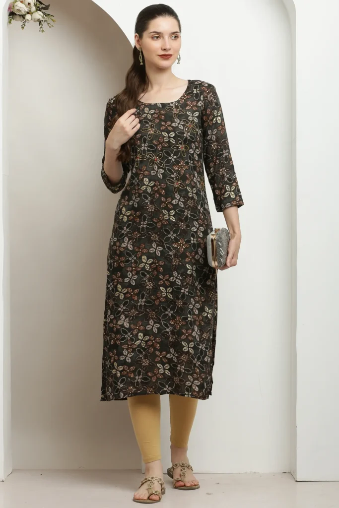 Vidalia Elegant Dark Brown Floral Print Kurta Regular Fit