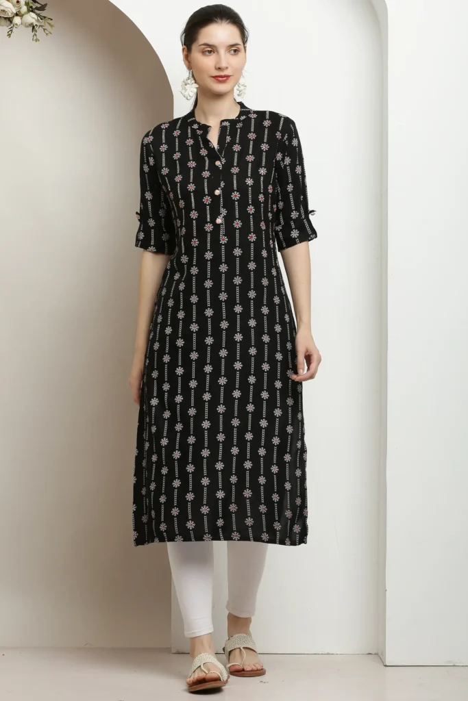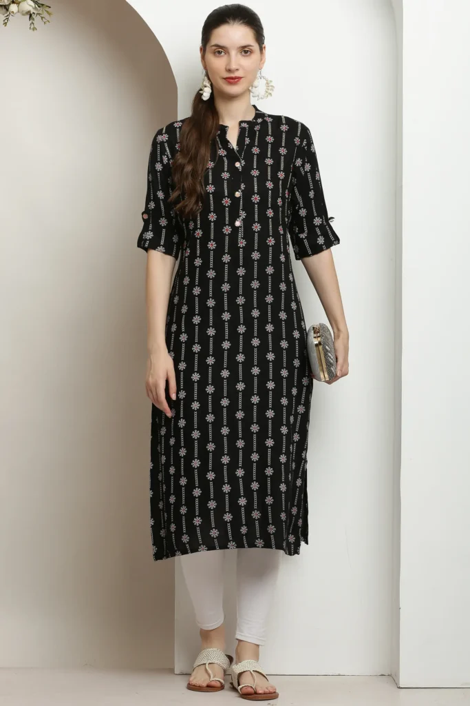 Vidalia Chic Black Floral Print Kurta with Mandarin Neck