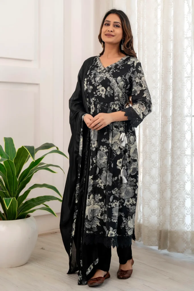Vidalia Black Floral Printed Anarkali Kurta Set with Lace Detailing